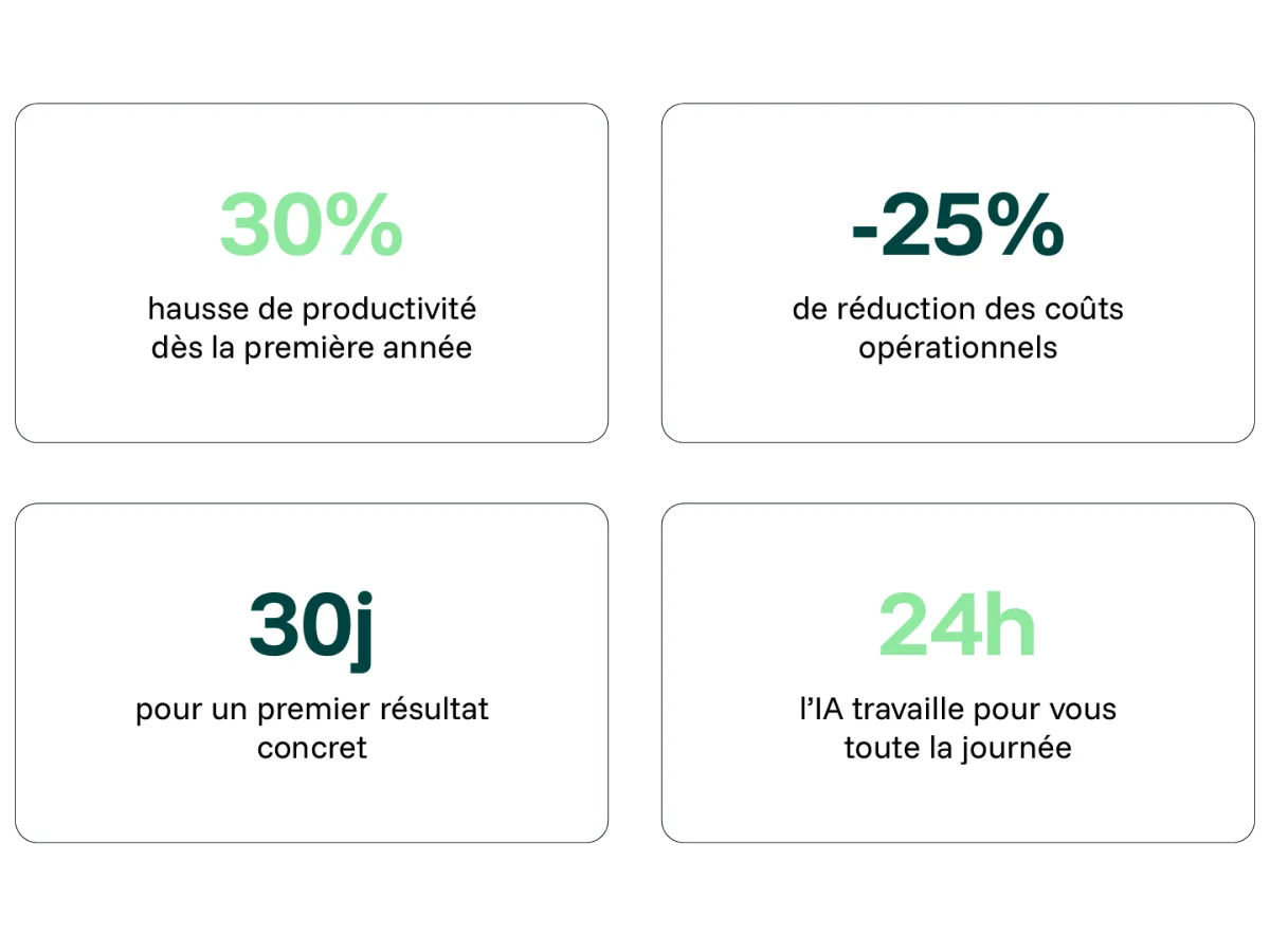 Avec notre Sprint IA, vous avez un premier résultat concret en 30 jours. Pour l'accompagnement de 8 semaines, les premiers gains de productivité sont visibles dès la 3e ou 4e semaine.